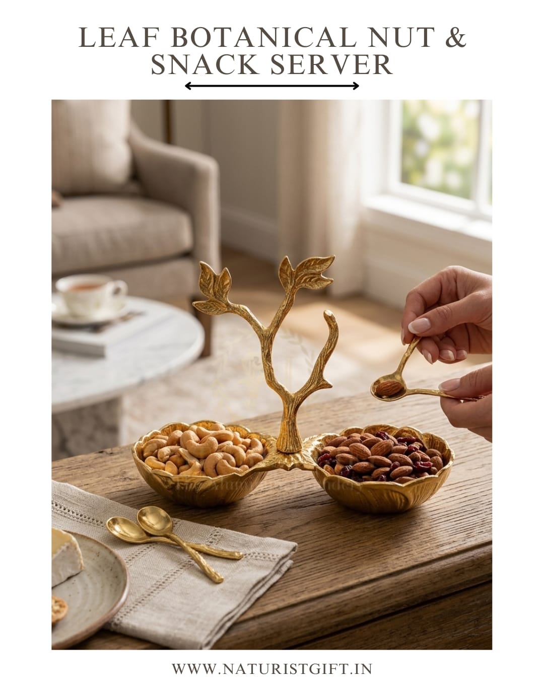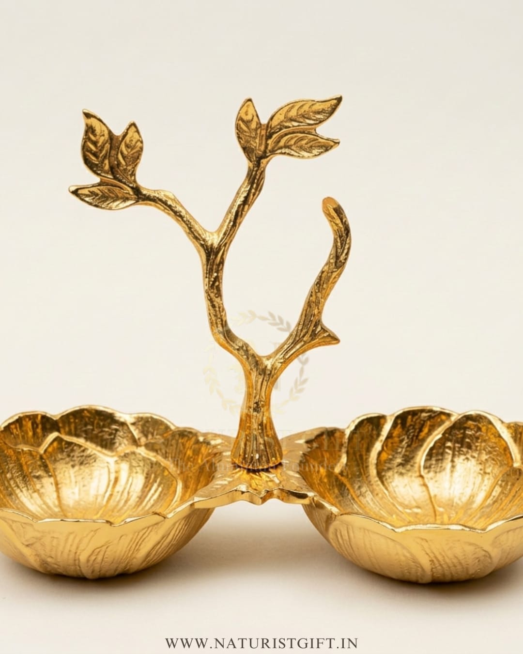 Whether you are serving roasted almonds, dried fruits, or gourmet candies, this piece brings a touch of Moradabad’s world-renowned craftsmanship directly to your tabletop. Finished in a radiant, high-shine gold, it serves as a stunning centerpiece for festive gatherings or an elegant accent for daily decor. Experience the perfect blend of nature and luxury with this signature creation from Naturist Gift™.