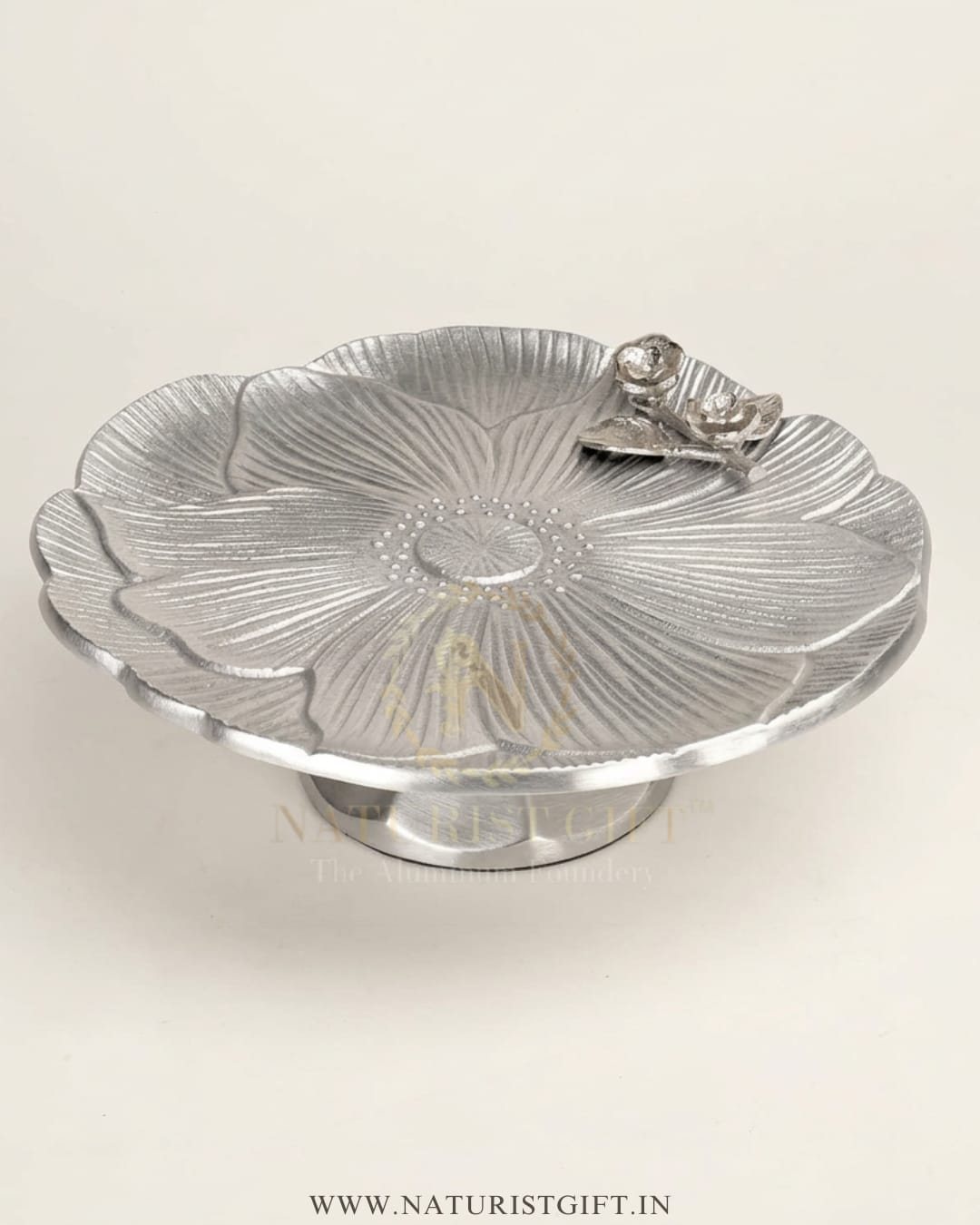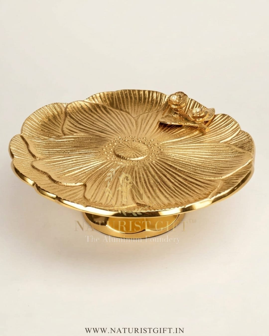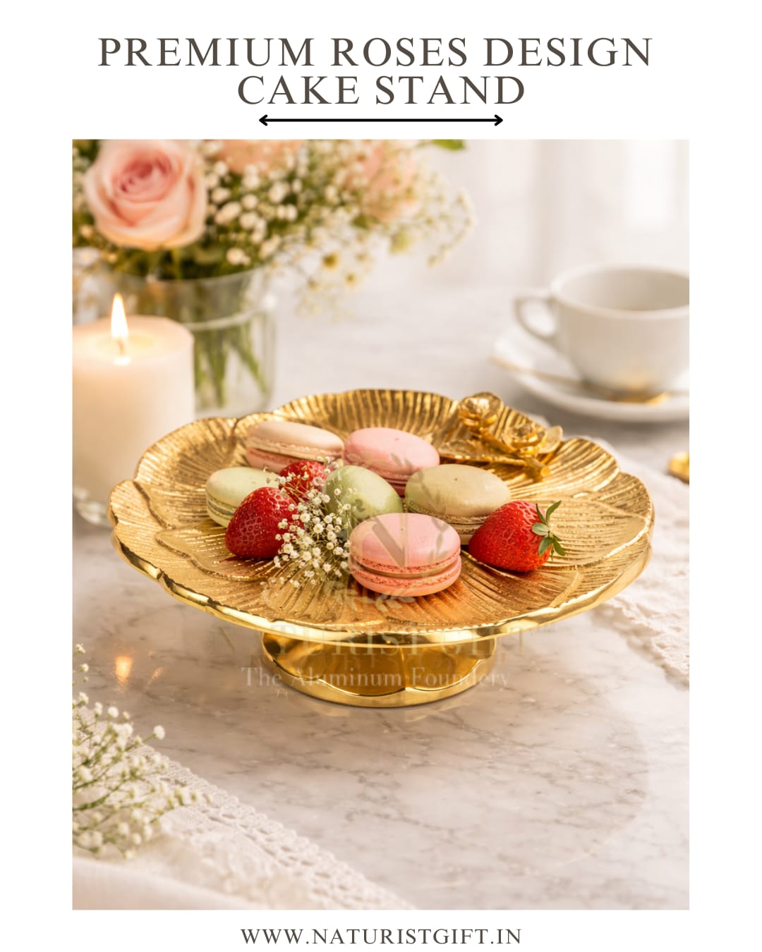 Elevate your celebration from ordinary to extraordinary with our Premium Roses Design Cake Stand. Inspired by the timeless beauty of nature, this exquisite pedestal features an intricate, hand-etched floral texture and delicate silver-finished rose accents that capture the light from every angle.Whether you are showcasing a decadent wedding cake or serving artisanal pastries at a high-tea, its brilliant gold-plated finish adds a touch of royal sophistication to any setting. Crafted with the signature artistry of Moradabad, this isn’t just serveware—it’s a statement piece.Experience the perfect blend of traditional craftsmanship and modern luxury with Naturist Gift™.