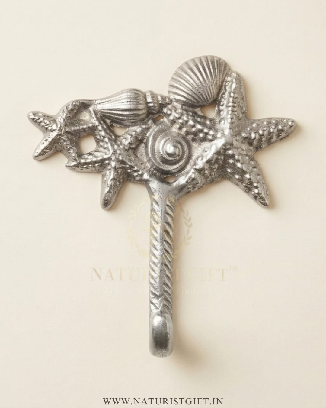 Crafted with meticulous detail—featuring an intricate cluster of intricate scallop shells, spiraled conchs, and textured starfish—it serves as both a beautiful, sustainable functional organizer and striking wall art. It’s perfect for draped a plush hand towel by your sustainable washbasin, adding a touch of “beach-chic” to an entryway, or adding a unique, nature-inspired accent to any room.
