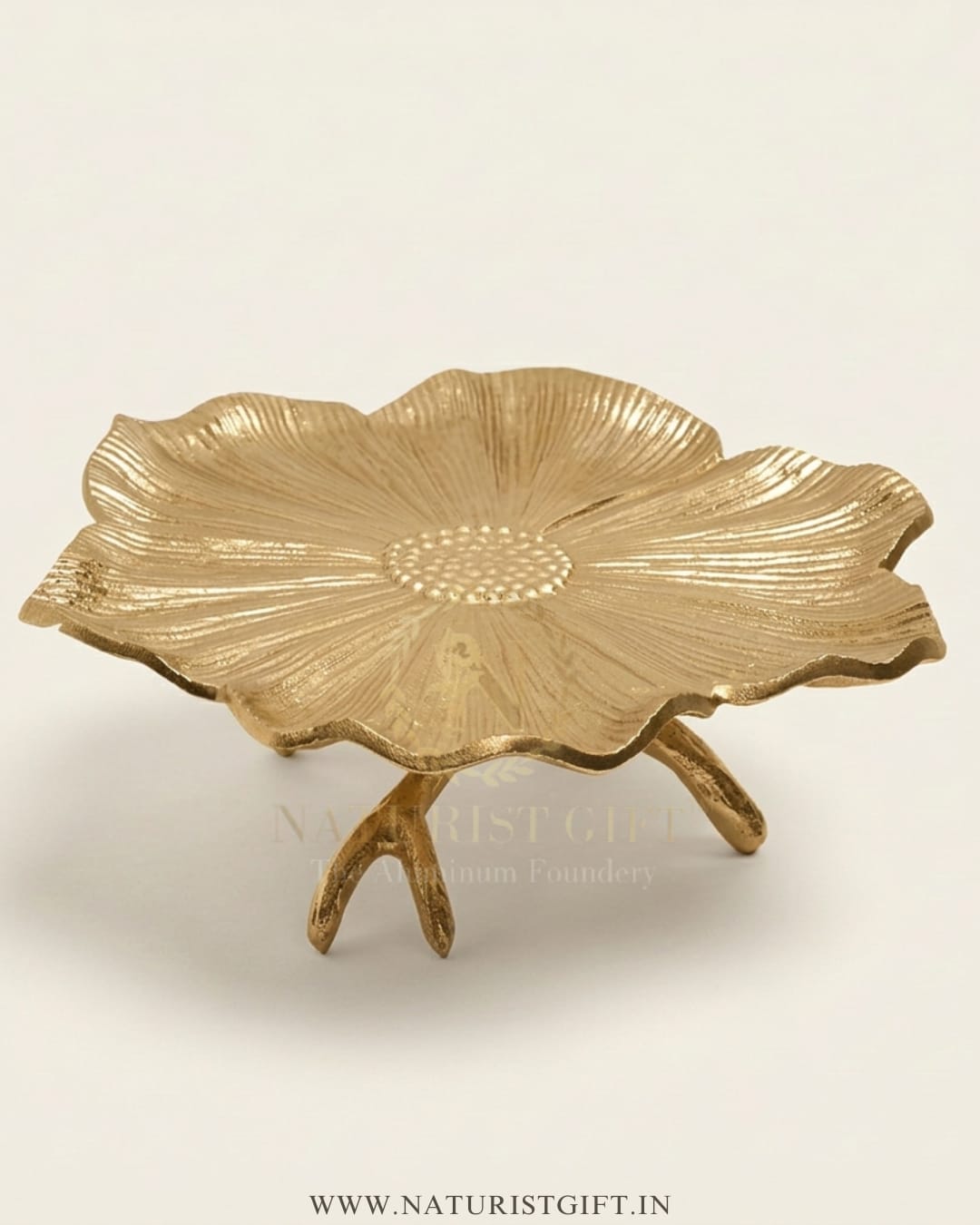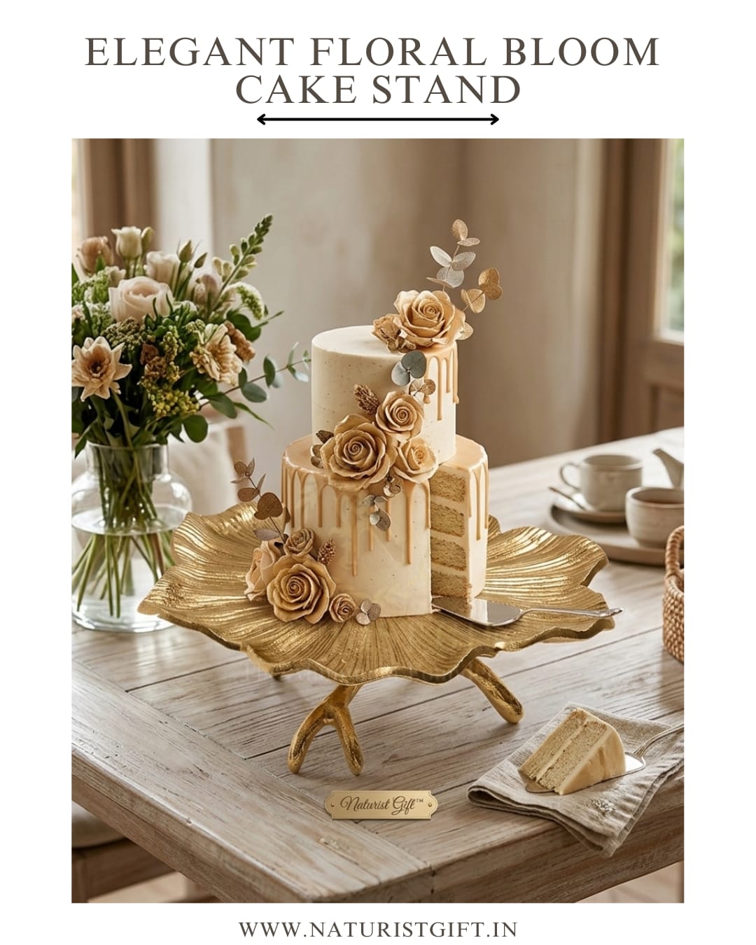 Bring a touch of artisan luxury to your table with this stunning floral-inspired cake stand. Meticulously crafted with a rich gold-plated finish, its intricate petal textures and organic twig-style legs create a masterpiece of functional art.Whether you’re displaying a signature dessert or using it as a sophisticated centerpiece, this piece by Naturist Gift™ embodies the heritage of Moradabad’s fine metal craftsmanship. Perfect for weddings, high-tea gatherings, or elevating your daily home decor.