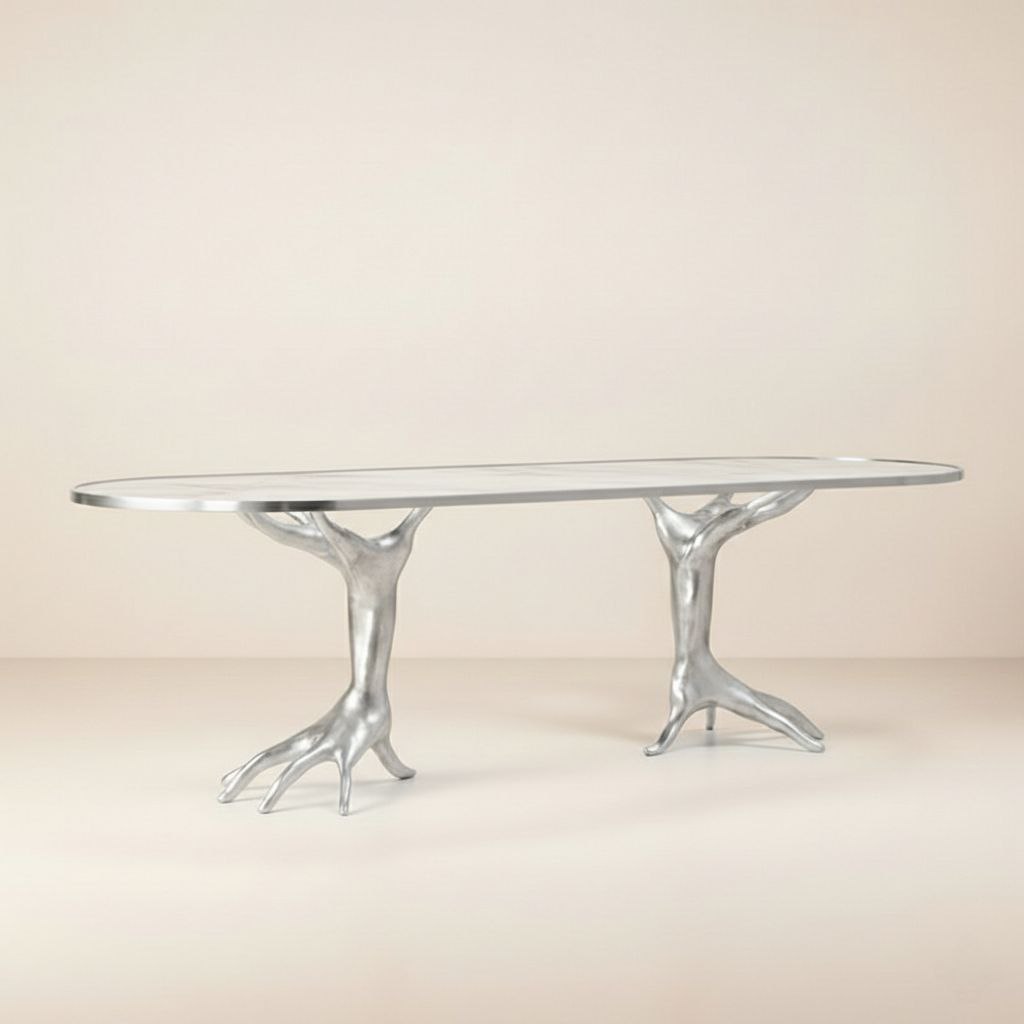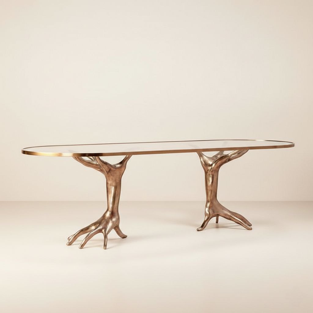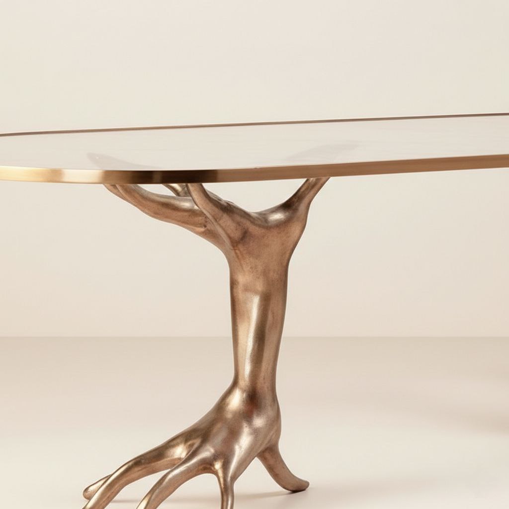 Redefine luxury in your living space with the Ethereal Bronze Limb Statement Table (Product Code: NG-RW-109), an exclusive masterpiece from the house of Naturist Gift™. This piece represents the pinnacle of our artisanal craftsmanship, where traditional metal-casting techniques from Moradabad meet avant-garde surrealist design. The dual bases, meticulously sculpted into fluid, limb-like forms, are finished in a deep, antiqued bronze that radiates a timeless warmth. Topped with a sleek, crystalline oval glass surface, the NG-RW-109 creates a stunning visual balance between raw, organic texture and modern refinement. Designed for those who seek to transform their interiors into a gallery of fine taste, this statement table is a testament to the quality and visionary elegance that Naturist Gift™ is known for globally.