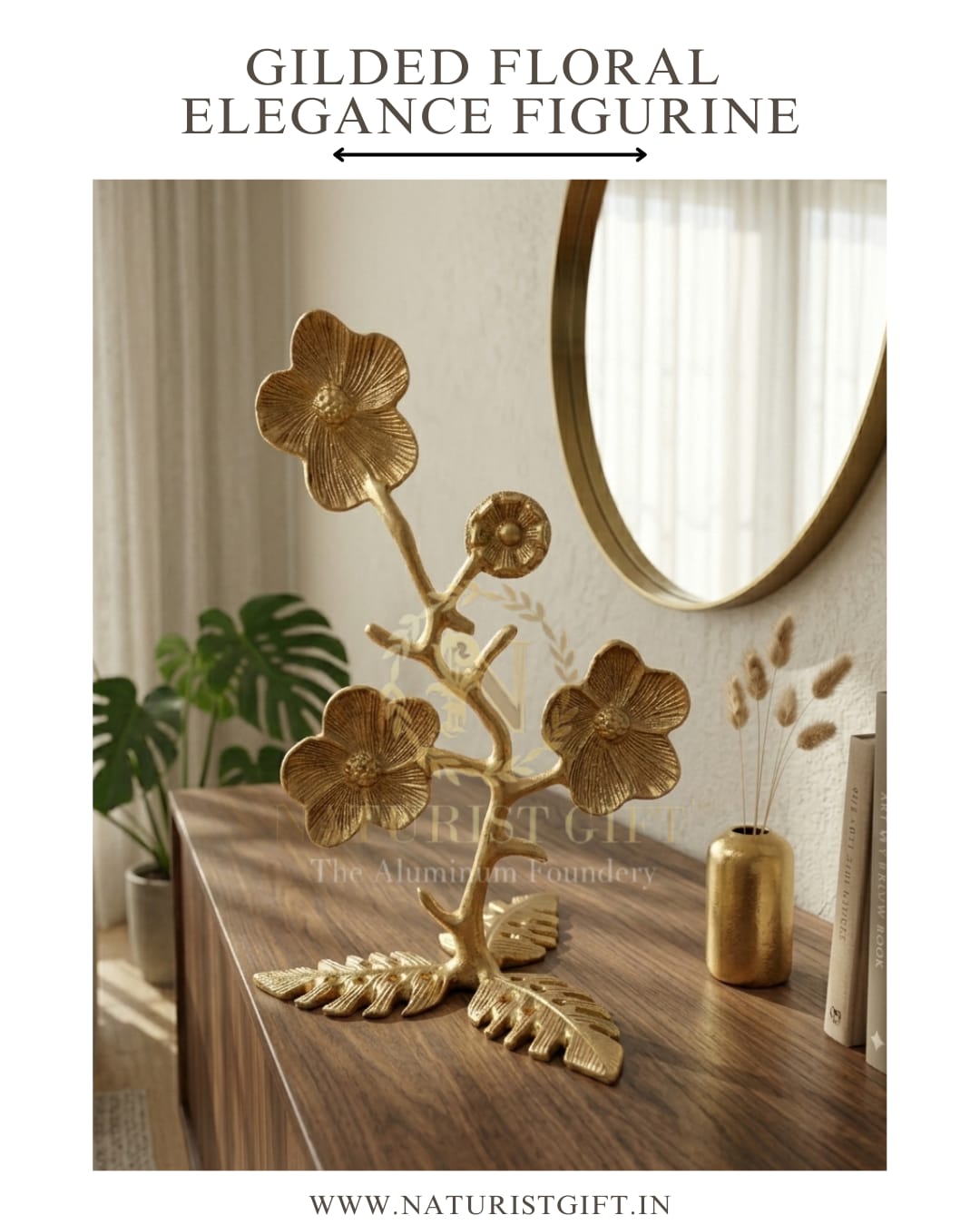 Elevate your home aesthetics with this exquisite, gold-plated floral sculpture. Meticulously handcrafted to capture the delicate intricate textures of blooming petals and organic stems, this piece serves as a timeless statement of luxury. Whether placed on a mantel, side table, or vanity, its radiant finish adds a warm, sophisticated glow to any interior.