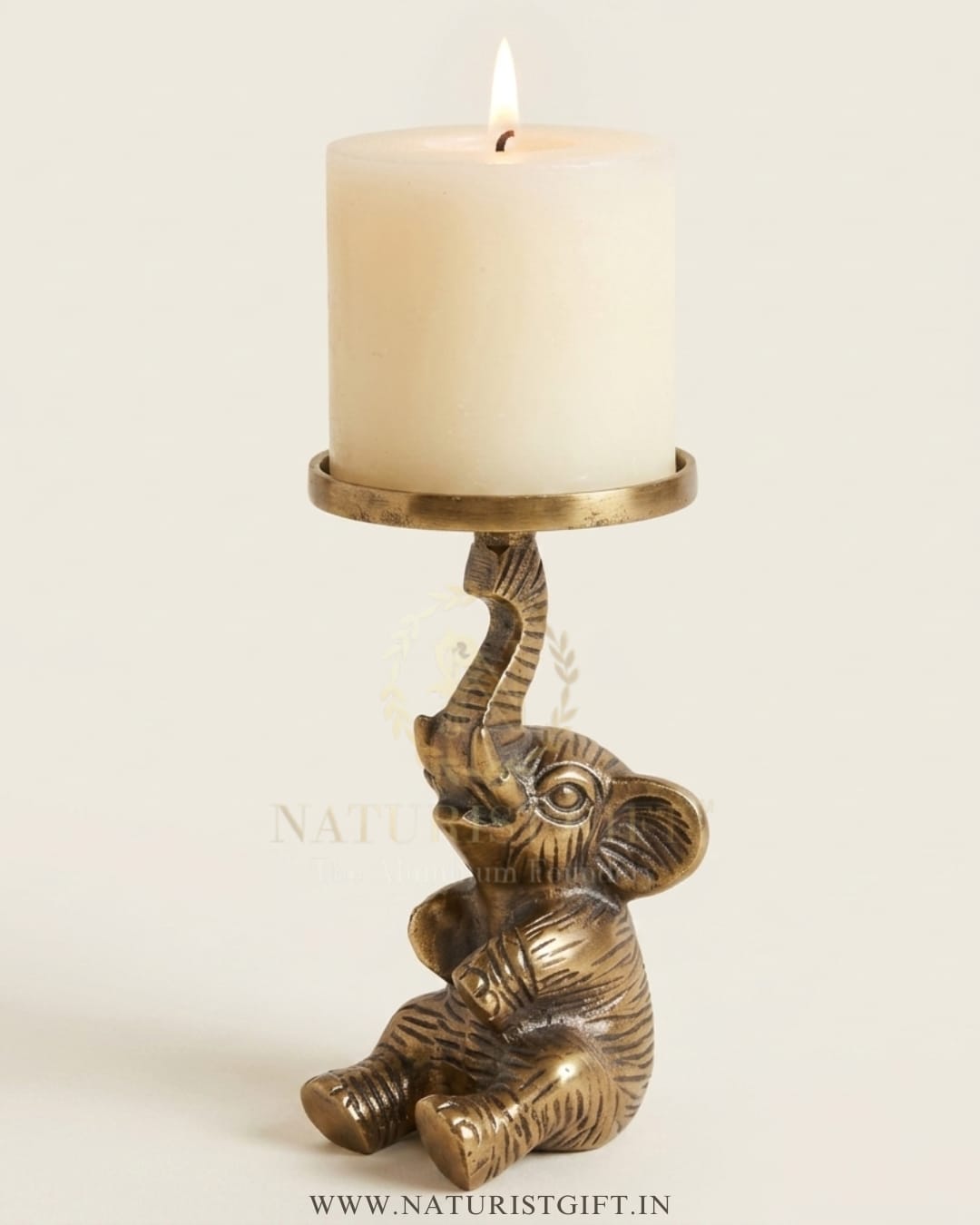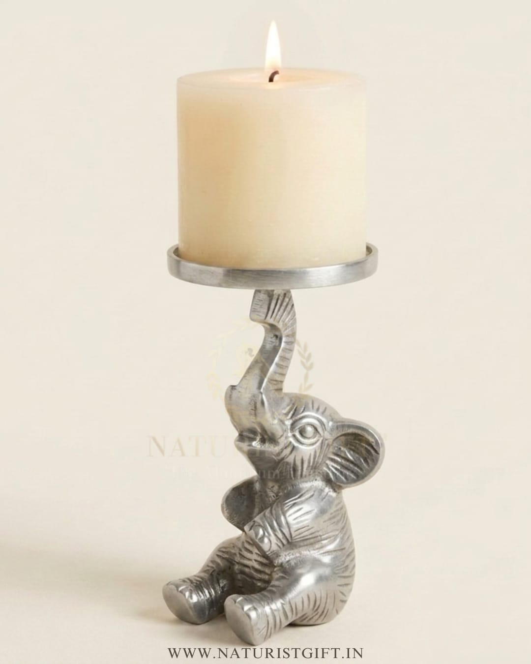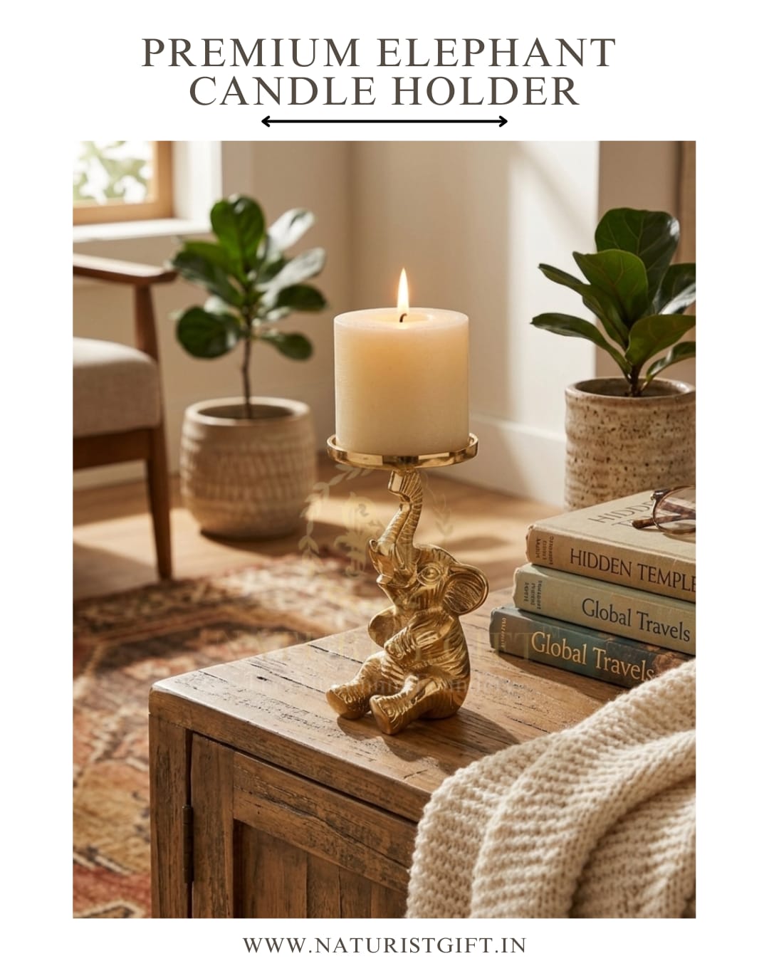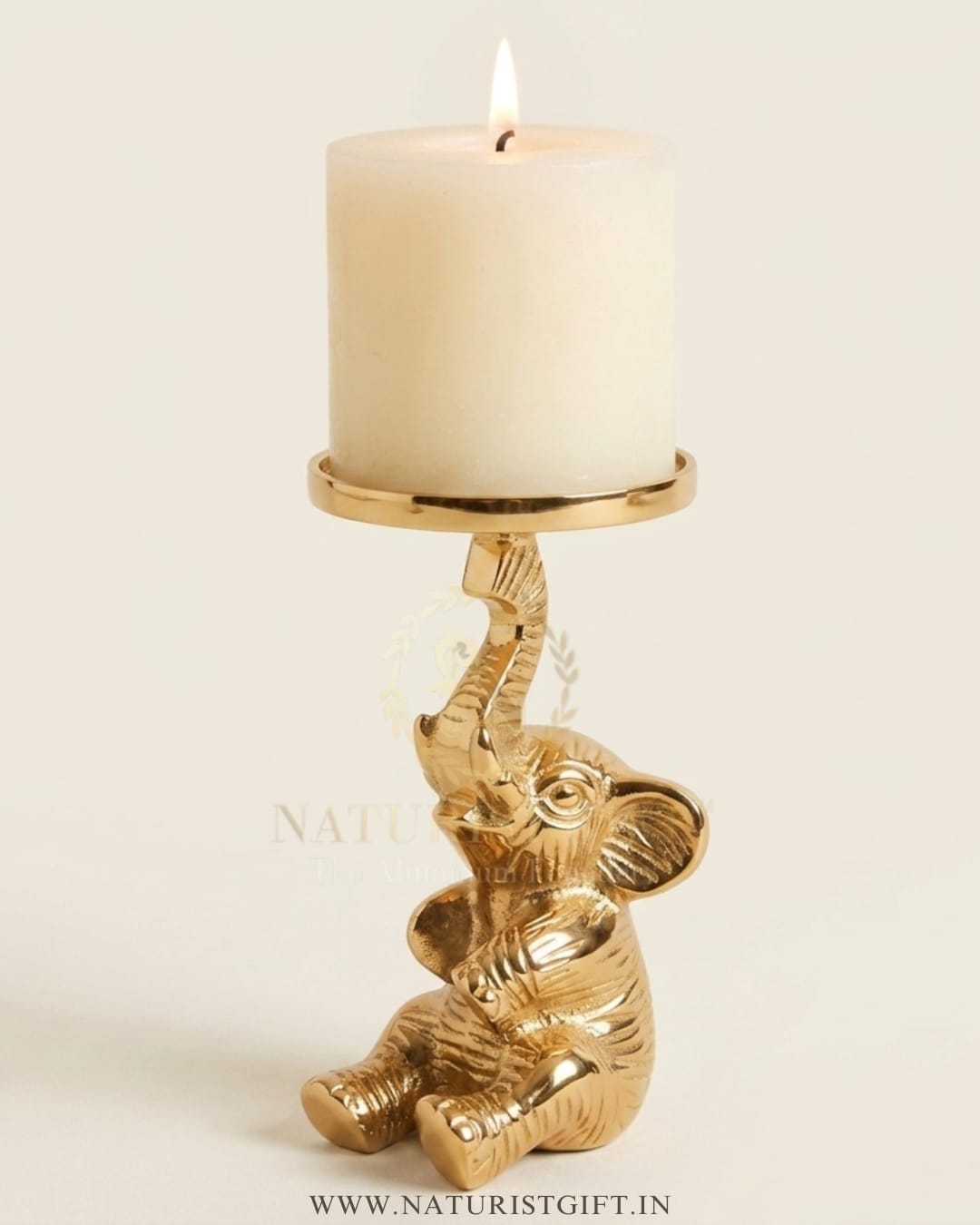 This Golden Elephant Candle Holder by “Naturist Gift™ is a premium handcrafted piece that combines symbolic elegance with functional luxury. Expertly manufactured in Moradabad from high-grade aluminum with a rich electroplated gold finish, it features an intricate upward-facing trunk design meant to bring strength and good luck to your space. Standing at 15 cm (5.9″) tall with a stable 8 cm (3″) base, this durable and sophisticated pedestal serves as a stunning centerpiece or a high-end gift for any occasion.