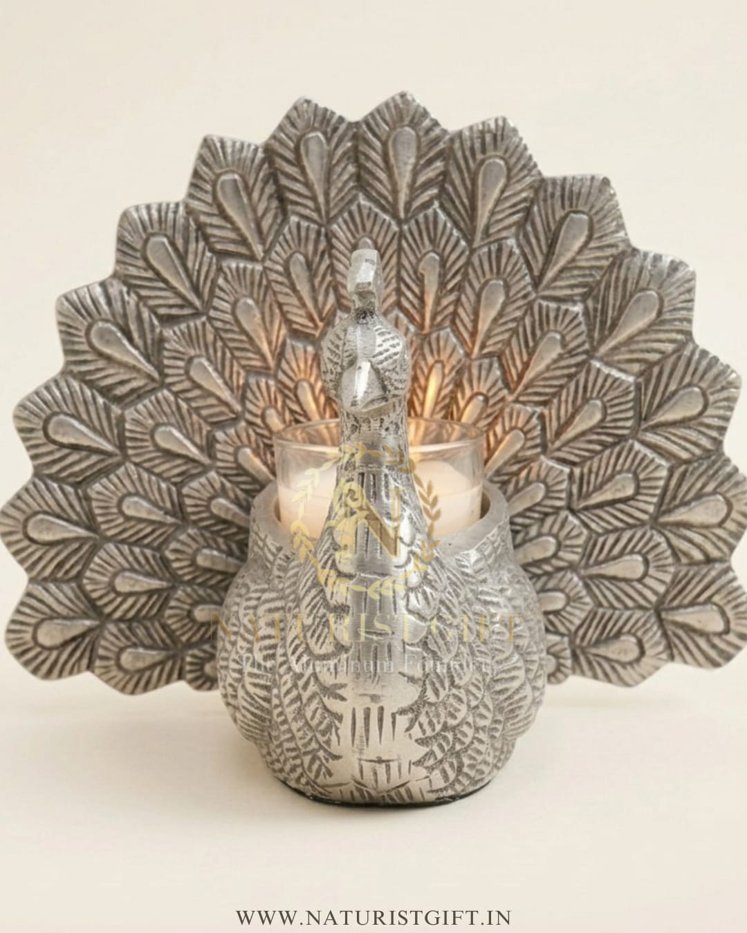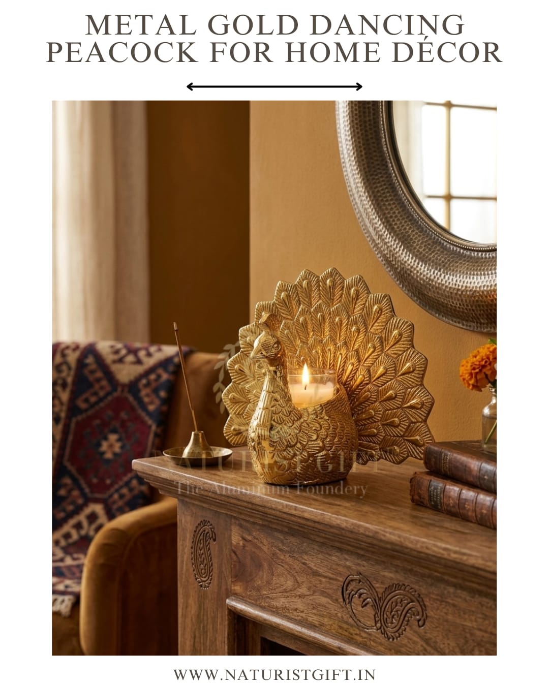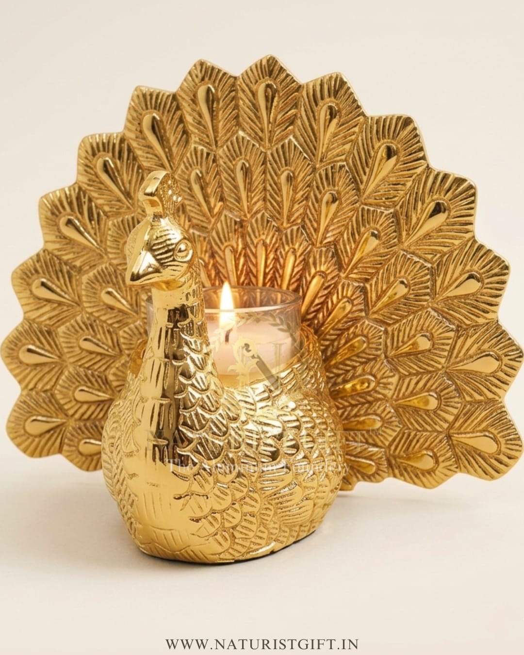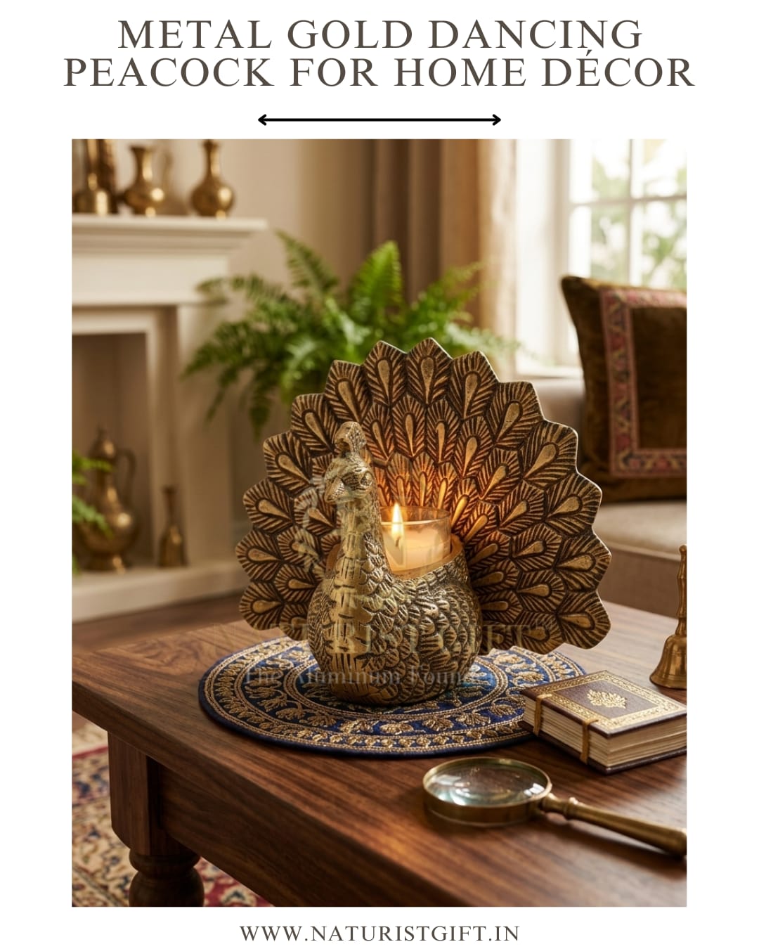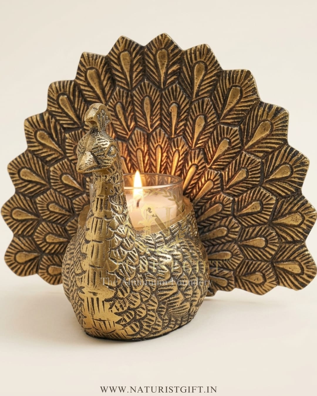 Expertly cast from high-quality metal with a stunning antique gold finish, this decorative showpiece by Naturist Gift™ captures the majestic beauty of a dancing peacock in intricate detail. The ornate feathers create a breathtaking backdrop for a warm candle glow, making it a perfect centerpiece for your coffee table, festive celebrations, or spiritual altars. Whether you’re looking to add a touch of traditional Indian royalty to your home or searching for a premium gift for weddings and housewarmings, this durable and rust-resistant piece combines artistic craftsmanship with functional charm.