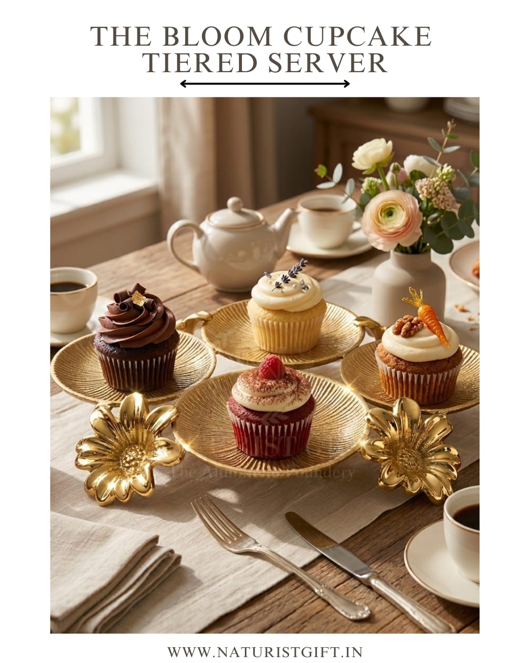 Elevate your dessert presentation with this beautiful tiered cupcake stand. Featuring elegant golden plates shaped like daisy blooms, this server adds a touch of sophistication to any celebration. Whether for a wedding, high tea, or family gathering, it’s the perfect showcase for your handcrafted treats. The Golden Bloom Cupcake Tiered Server is a wonderful Naturist Gift™ for the gracious host.
